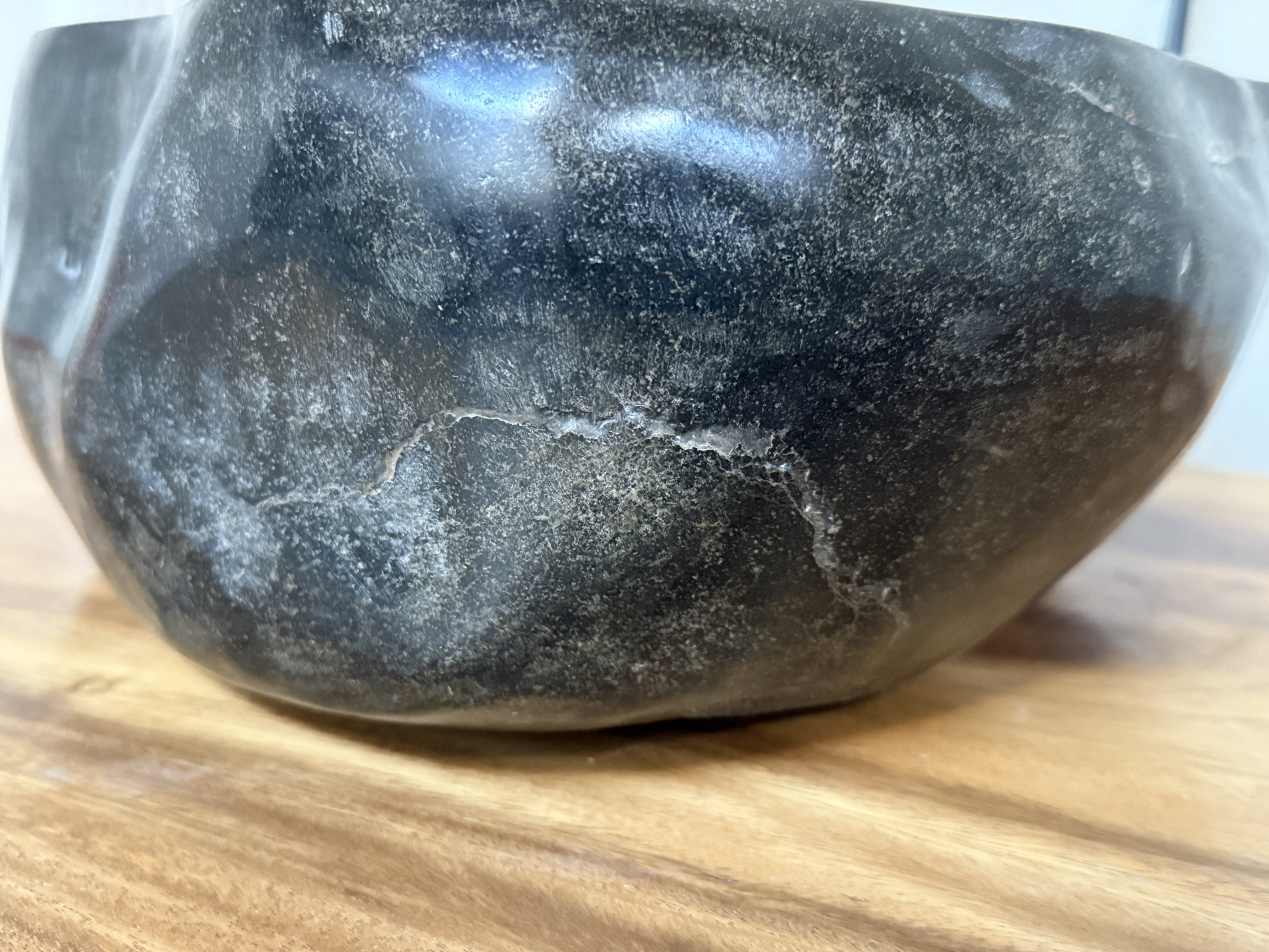 Das Waschbecken ist aus einem Flussstein gefräst und von Hand geschlagen. Es ist innen sowie außen poliert und in der natürlichen Form des Steines naturbelassen.